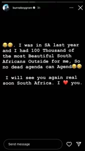 “I was in SA last year and I had 100 Thousand of the most Beautiful South Africans Outside for me,” he posted, referencing his headline performance at DSTV Delicious last year.