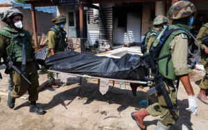 The bodies of Palestinian assailants were sprawled on the ground of the kibbutz Tuesday, some still wearing their thin black bulletproof vests.