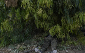 Six body bags lay next to three children’s bicycles in the kibbutz of Kfar Aza Tuesday, where Hamas terrorists massacred more than 100 civilians during the weekend’s devastating assault that killed over 1,000 people in the south of the country.