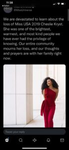 The Miss Universe and Miss USA community also shared condolences and fond memories of the beauty queen. They described her personality as “one of the brightest, warmest, and most kind people we have ever had the privilege of knowing.”