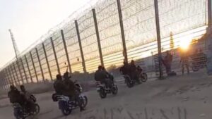 Another image showed at least five motorbikes, each carrying two militants armed with rifles, passing through a hole which had been cut in the wire fence section of the barrier.