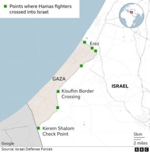 At 05:50 local time, a Telegram account associated with Hamas’s armed wing posted the first images from the ground, taken at Kerem Shalom – the most southern of Gaza’s crossings.