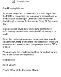 The email from Kwezi Sogoni states that: “as per our telephonic conversation, it is with regret that the POEM (Private Office of the Executive Mayor) is requesting you to postpone preparations for the Executive Swearing-in Ceremony which had been (tentatively) scheduled for tomorrow, Friday 10 December 2021. Circumstances beyond our immediate control have unfortunately necessitated that this difficult decision be made.”