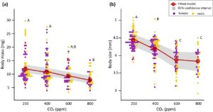 What they found came as a surprise. Beetles grown under heightened levels of atmospheric CO2 experienced lower survival rates, and were smaller in size. “When raised under CO2 levels predicted for the year 2070, a third fewer beetles emerged and were 14% smaller in size when compared to pre-industrial CO2 levels,” Tocco said.