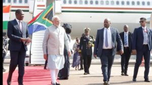 India’s Prime Minister Narendas Modi is received by Deputy President Paul Mashatile after landing at the Waterkloof Air Force Base in Pretoria